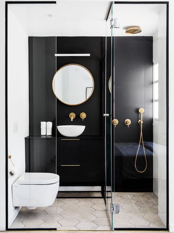 What could be better than a black and white bathroom? I especially love the gold accents and the thick white marble counter, BEAUTIFUL!